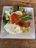 Grilled salmon topped w/ chimichurri and tomato. Served w/ a side of Mixed green salad, grilled asparagus, and mashed potatoes. Includes garlic bread.